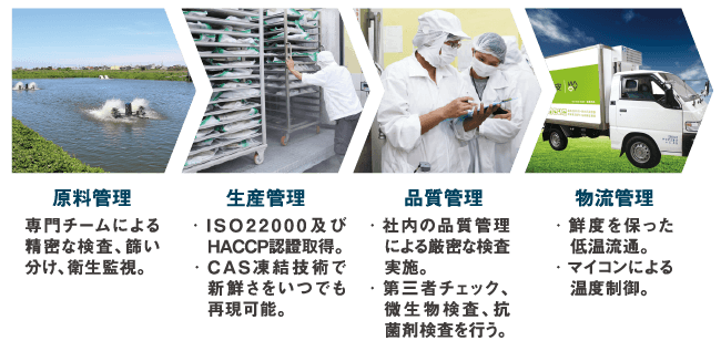 CAS 凍結技術で新鮮さをいつでも再現可能。 ISO22000 及びHACCP 認證取得。