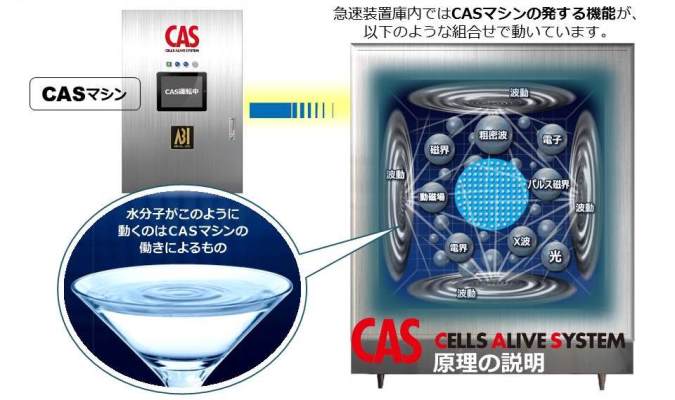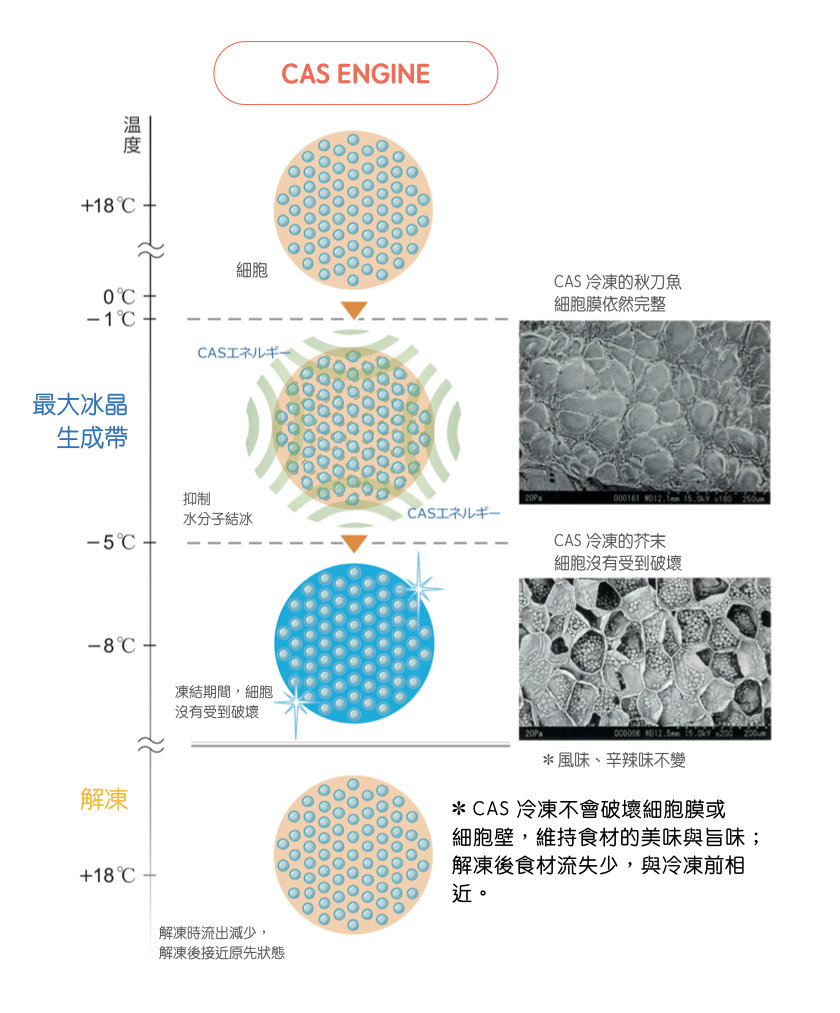 CAS 核心的技術利用電磁波,讓食材細胞內的水分子發生振盪,水分子即使處在攝氏零度以下,也不會結冰的過冷狀態。當水溫達到理想溫度時,再讓食材瞬間凍結,由於大型冰晶的生成,受到了抑制,因此能保護細胞完整,維持食材新鮮。