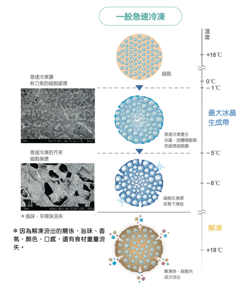 因細胞膜破裂,解凍之後細胞內的水分、營養與風味成分也跟著流出,最後食材重量也跟著減少。