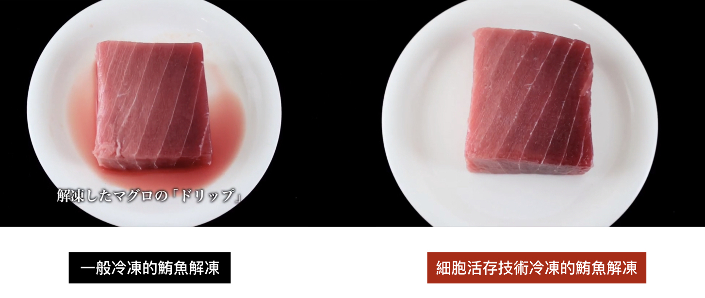 上圖,左邊是一般急速冷凍的鮪魚;右邊則是以 CAS 技術冷凍的鮪魚;不同冷凍方式冷凍的鮪魚,解凍之後,可以發現左圖有明顯的血水滲出(嚴格來說血水不是血,而是肌紅蛋白)。