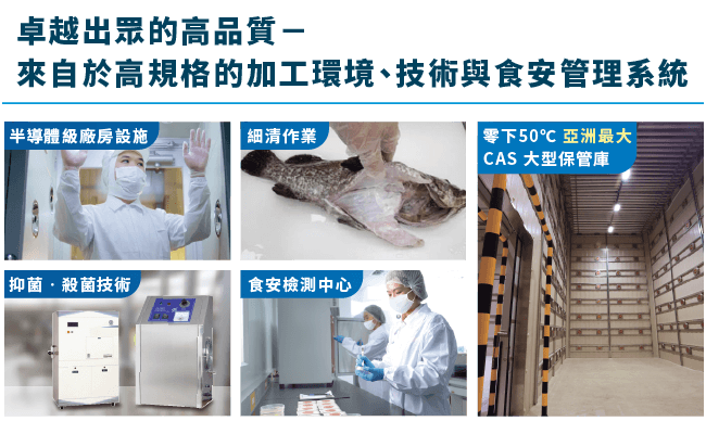 - 以半導體級的標準所設置的水產加工產線,生產區採用潔淨室規劃設計,引進全自動化與半自動化生產設備,降低客戶製造成本,確保產品安全及品質保證。